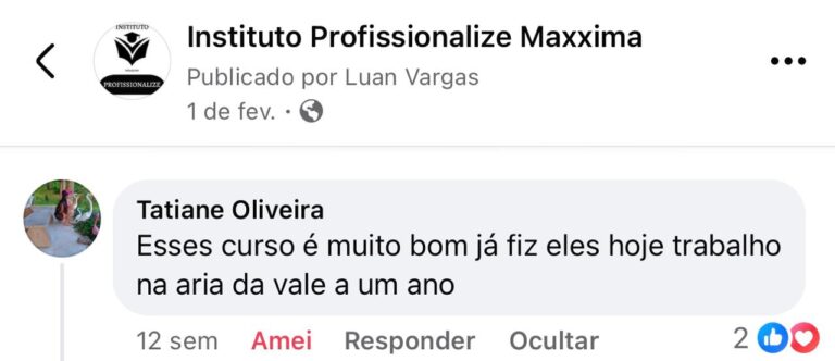 Nossa instituição possui hoje 104 cursos disponíveis e possui mais de 25.000 alunos em todo o mundo, você pode nos verificar em depoimentos e em nosso INSTAGRAM @inst.profissionalizemaxxima.